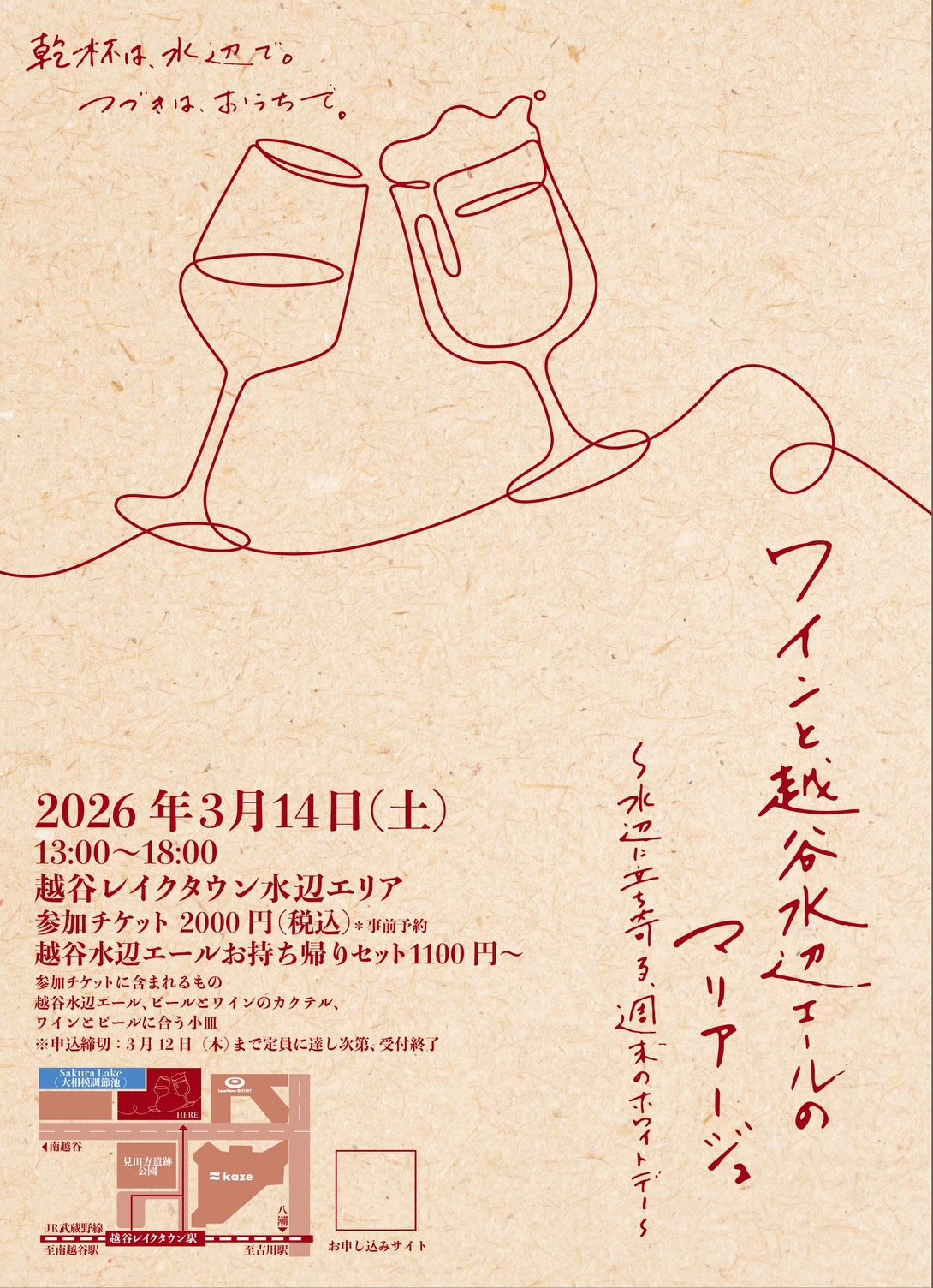 今年のホワイトデーは、水辺に立ち寄って、少しだけ特別な時間を過ごしませんか。 青空の広がる午後から、夕焼けがきれいなマジックアワーまで。ワインとクラフトビール「越谷水辺エール」のマリアージュを楽しむ、心地よい一日をご用意しました。